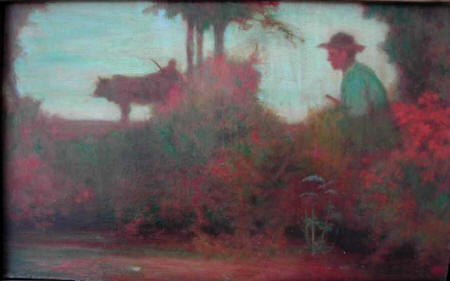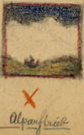 Der in der Besitzerfamilie überlieferte Titel "Jagdszene" scheint nicht recht plausibel, denn bei dem Tier im Hintergrund scheint es sich doch eher um ein Nutztier zu handeln denn um ein jagdbares Wild. Auf Grund der Vegetation mit den vielen Alpenrosen und einer "Briefmarkenskizze", die andeutungsweise eine ähnliche Szene enthält wie hier und mit "Alpauftrieb" beschriftet ist, benennen wir dieses Bild vorerst mit diesem Titel.