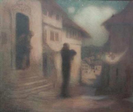 Der Titel dieses Bildes stammt ebenso wenig von Basler selber wie jener des gleichnamigen Bildes mit der Zusatznummer 2. Vielmehr haben wir mangels besseren Wissens den in der jetzigen Besitzerfamilie überlieferten Titel für dieses Werk übernommen und auch auf das erwähnte zweite Bild mit nahezu dem gleichen Inhalt angewandt. Bei beiden handelt es sich um Kreidegemälde mit den nahezu gleichen Figuren, lediglich in eine jeweils unterschiedliche Umgebung hineingestellt. Trotz des in beiden Bildern enthaltenen, auffälligen und mit grösster Wahrscheinlichkeit für den mythologischen Hintergrund entscheidenden Details des scheinbar in der Luft in einem Lichtschein schwebenden Säuglings ist es uns noch nicht gelungen, die literarische Quelle für das Motiv zu identifizieren.