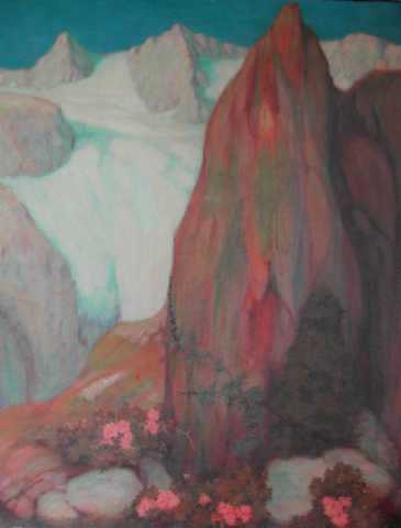 Der Name des Bildes ist in der Familie so überliefert und stammt sicher von Basler, das Bild war unter diesem Namen an der Ausstellung von 1931. Wir wissen nicht, ob ihm ein mythologisches Motiv zu Grunde liegt. Denkbar wäre es, Felsen sind ja normalerweise nicht rot. Es könnte sich aber auch um eine Landschaft im Maderanertal, wo Basler fast jährlich weilte, oder im Berner Oberland handeln.
