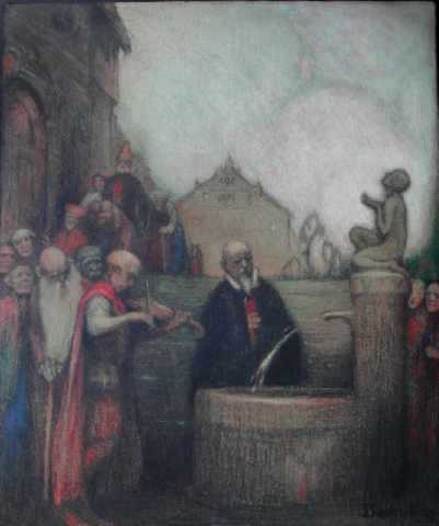Das Motiv ist nicht bekannt. Gemäss Überlieferung in der Familie soll der Brunnen der Stadt versiegt sein. Ein fremder Geiger soll ihn mit seinem Spiel wieder zum Fliessen gebracht haben. Eine entsprechende Sage oder ein Märchen konnte bisher nicht gefunden werden.