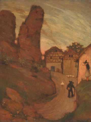 "Drei Jahre und ein Tag" könnte das Bild auch heissen. Es erzählt, so dürfen wir auf Grund des von Basler selber stammenden Titels annehmen, von der Rückkehr eines Handwerksgesellen in seiner typischen Kluft mit dem "Charlottenburger", dem Bündel mit den Werkzeugen und Habseligkeiten des Burschen, und dem "Stenzel", dem vom Geissblatt in natürlichem Wuchs korkenzieherartig eingeschnürten, unverwechselbaren Wanderstock, von der Wanderschaft in sein Heimatdorf. Welcher Berufsgattung er angehört, können wir nicht mit Sicherheit erkennen, dem breitkrempigen Hut nach am ehesten derjenigen der Zimmerleute. Basler fängt den ersten Augenblick der Heimkehr, des Einzugs ins heimatliche Dorf, ein. Es ist späterer Abend in der warmen Jahreszeit, die Tagesarbeit ruht, die Sonne steht hinter dem Dorf tief am Horizont, niemand auf der Strasse, der den Wanderer willkommen heisst. Der gleichgültig pfeifenrauchende Dorfbewohner jedenfalls scheint den vermeintlichen Fremdling noch nicht als einen der Ihren erkannt zu haben. Basler, der schmunzelnde Erzähler, lässt sogar die Gänse dem Zurückgekehrten nur die Schwanzfedern zeigen. Heimkehr in die Fremde also? Nein! Die Riegelhäuser laden ein in ihre Geborgenheit, die Stimmung ist freundlich. Man wird sich wiedererkennen. Die Wiedersehensfreude steht dem Gesellen und die Überraschung dem ganzen Dorf noch bevor. Für das Federvieh ist zu hoffen, dass es diese unversehrt an Leib und Leben und bei guter Gesundheit überleben wird, diesmal wenigstens noch.