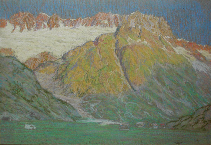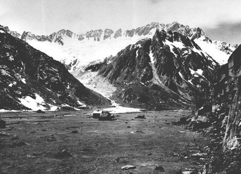 Eine Ferienerinnerung Baslers und eines seiner seltenen Landschaftsbilder. Zum Vergleich eine alte Fotografie, aufgenommen wenig weiter rechts des von Basler gewählten Standortes, noch vor dem Bau des Staudammes, gefunden auf der Homepage des Berggasthauses Dammagletscher, Göscheneralp (www.dammagletscher.ch/ fotogalerie4.html). Heute befindet sich an dieser Stelle der Göscheneralpsee.