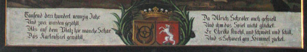 Gründungslegende, auf welchen in je acht Zeilen in gereimter Form das Geschehen