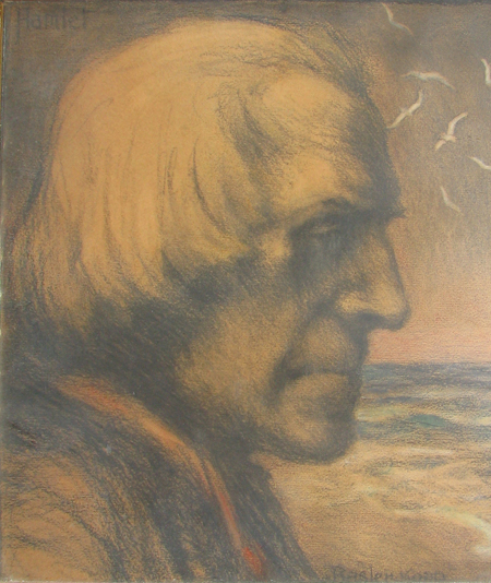 Kreide auf Papier, 34.5x30.8 cm, o.l. bezeichnet "Hamlet", u.r. signiert "Basler-Kopp" In Privatbesitz in Luzern