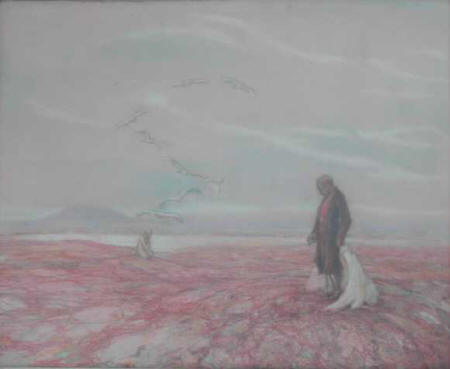 Eine weitere Darstellung des Themas „Schwanenjungfrau“. Es gibt eine Erzählung, in der die Rede von insgesamt zehn Schwanenjungfrauen ist, die jeweils zusammen kommen und gehen. Der jüngsten nimmt der Jäger ihr Kleid weg und sie muss fortan bei ihm bleiben. Auf diesem Bild sind indessen lediglich 9 Jungfrauen bzw. Schwäne zu erkennen. Es wäre aber schon möglich, dass es sich um die gleiche Erzählung handelt. Dargestellt ist hier jedenfalls der Moment des Raubes des Schwanenkleides.