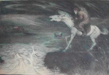 Dieses Bild stellt, wie "Schimmelreiter 2" und "Schimmelreiter 3", die auf Grund der nahen stilistischen Verwandtschaft in der gleichen Zeit (um 1924) entstanden sein dürften, die dramatische Schlussszene aus Theodor Storms Novelle „Der Schimmelreiter“ dar. Zusätzlich zu den in den anderen beiden Werken dargestellten Motiven zeigt Basler hier auch den Wagen, in welchem Hauke Haiens Frau Elke und seine Tochter Wienke ahnungslos ins Verderben fahren. Die drei Darstellungen wurden auf nahezu dem gleichen Format gemalt.