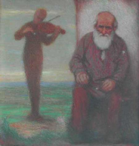 Das Motiv ist nicht bekannt. Der Titel stammt von Basler selber. Er steht von seiner Hand geschrieben auf der Rückseite des Bildes. Was damit gemeint ist, wissen wir aber nicht. Das Bild war unter diesem Titel an der Gedächtnisausstellung von 1938 zu sehen. Es ist eines von mehreren Beispielen ausdrucksstarker, meist alter Männergesichter, die ganz verschiedene Gefühlslagen ausdrücken können, hier zum Beispiel Nachdenklichkeit, Besinnung, Seelenfrieden, Bereitschaft zum letzten Gang.