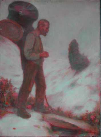 Vermutlich ist dieses Bild die Darstellung einer Wetterlaune, wie man sie in den Bergen gelegentlich erleben kann. Man beachte die blühenden Alpenrosen! Und alles unter Schnee. Der Senn, dem Kupferkessel nach zu beurteilen trotzdem auf dem Weg zur nächsthöheren Alp.