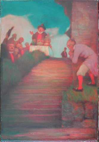 Das Motiv dieses Bildes wäre wohl auf den ersten Blick nicht ohne Weiteres zu erkennen, aber glücklicherweise hat sich in der Familie der Besitzer der offenbar von Basler selber stammende Titel überliefert. Dem Gemälde liegt demnach das bekannte, gleichnamige Märchen der Gebrüder Grimm zu Grunde. Es zeigt die Szene, in der der erste der drei vom Vater weggejagten Brüder, der in der Fremde Schreiner gelernt und von seinem Lehrmeister zum Abschied ein Wundertischchen bekommen hat, dieses im Wirtshaus vorführt. Der Wirt beobachtet die Zauberei und wird dem Gesellen in der nächsten Nacht das Tischchen wegnehmen und durch ein genau gleich aussehendes austauschen. Basler hat die im Märchen eigentlich im Innern des Wirtshauses spielende Szene ins Freie verlagert.