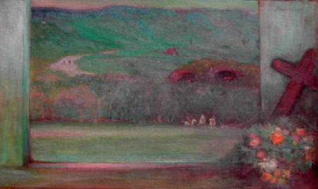 Das Motiv dieses Bildes ist völlig im Dunkeln. Es stellt eine Landschaft aus einem Fenster heraus gesehen dar, ein Fenster, an dem Blumen und ein Kreuz stehen. Auf dem gegenüberliegenden Hang sieht man drei mit Stroh gedeckte Häuser, in der linken, oberen Bildecke ein viertes Haus. Auf der der Ebene (oder ist es ein Fluss?) im Vordergrund gegenüberliegenden Seite ist eine Gruppe von Reitern zu sehen, auf der Strasse, die zu den zwei grösseren Häusern führt, zwei winzige Gestalten. Aus der Tatsache, dass Basler kaum je Details malt, die mit dem eigentlichen Motiv nichts direkt zu tun haben, nichts dazu beitragen, darf geschlossen werden, dass alle diese Details für das Motiv relevant sind. Faute de mieux wird auch hier der aus der Luft gegriffene Titel vorderhand beibehalten. Das Bild ist in Wirklichkeit sehr blass. Wir wissen nicht, ob das in der Absicht von Basler lag, oder eine Alterungserscheinung ist. Für die Wiedergabe hier wurde es etwas nachgedunkelt und im Kontrast verstärkt.