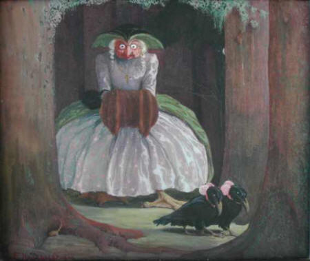Das Motiv ist unbekannt. Mit grösster Wahrscheinlichkeit handelt es sich um ein Märchen, doch konnte trotz der Raben mit ihren auffälligen Halskrausen bisher keine entsprechende Erzählung gefunden werden. Merkwürdig das Vogelgesicht der Hexe und schon fast grotesk die Dominanz von Hühner- bzw. Vogelfüssen auf dem Bild. Die Raben haben selbstverständlich den Anspruch auf solche, bei der Hexe ist das nicht unbedingt zu erwarten, doch hat Basler ja auch der "Moorhexe" derartige Gehwerkzeuge verpasst. Sogar der Baum links scheint Hühnerfüsse zu haben und wir dürfen annehmen, dass auch das kleine Mäuschen solche hat, wenn man sie denn sähe.