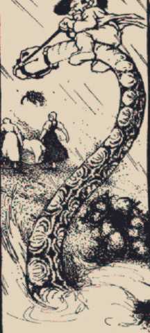 Die Flut unten schwoll verdächtig rasch an, kam ganz dick und gelb dahergeschnellt, und die Bauern stürmten aus den Häusern, um den Verwüstungen des Hochwassers zu wehren. Die zwei Mädchen liefen auch mit und kamen gerade dazu, als auf der ersten bösen Welle eine ungeheure Schlange daherschoss, baumlang und über den ganzen Rücken gelb und schwarz gemustert. Und sieh einmal! Auf dem Ungetüm von einem Wurm ritt das grüne Männchen, das sie vorher angesprochen. Das Hälfterchen hatte es der Schlange angelegt und zügelte sie damit wie ein Rösslein. Vor dem Trockenplatz, um den sich der Fluss herumschlängelt, bäumte sie sich schrecklich züngelnd hochauf, sprang über den Rasen hinweg und glitt weiter unten wieder ins Wasser, dass der kleine Reiter in den Wogen auf und ab tanzte.